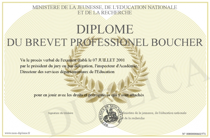 Envoyez par email votre Diplôme du BREVET PROFESSIONEL BOUCHER personalisé