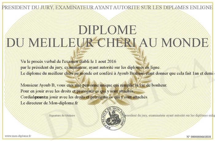 Envoyez par email votre Diplôme du meilleur chéri au monde personalisé