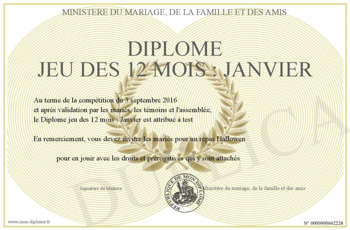 Envoyez par email votre Diplôme jeu des 12 mois : Janvier personalisé