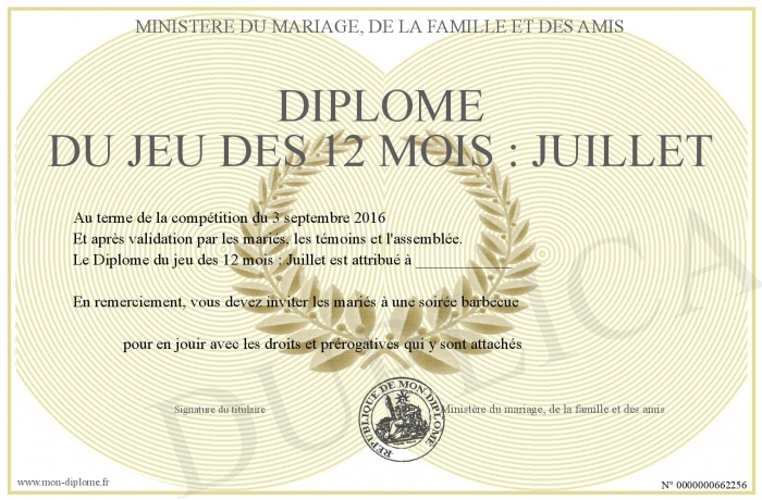 Envoyez par email votre Diplôme du jeu des 12 mois : Juillet personalisé
