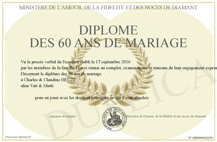 Envoyez par email votre Diplôme des 60 ans de mariage personalisé