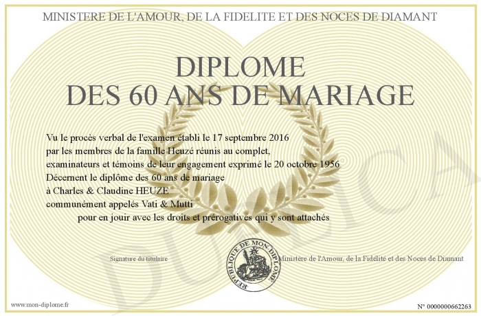 Envoyez par email votre Diplôme des 60 ans de mariage personalisé