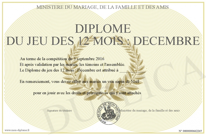 Envoyez par email votre Diplôme du jeu des 12 mois : Décembre personalisé