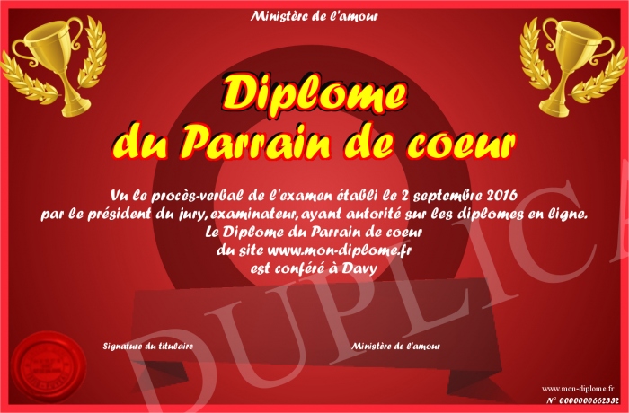 Envoyez par email votre Diplôme du Parrain de coeur personalisé