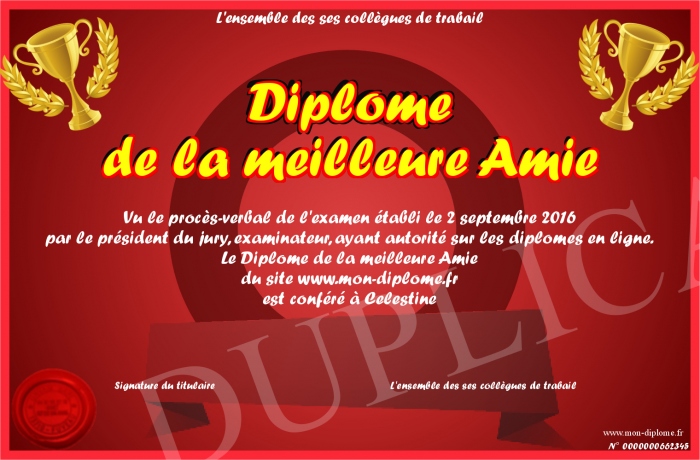 Envoyez par email votre Diplome de la meilleure Amie personalisé
