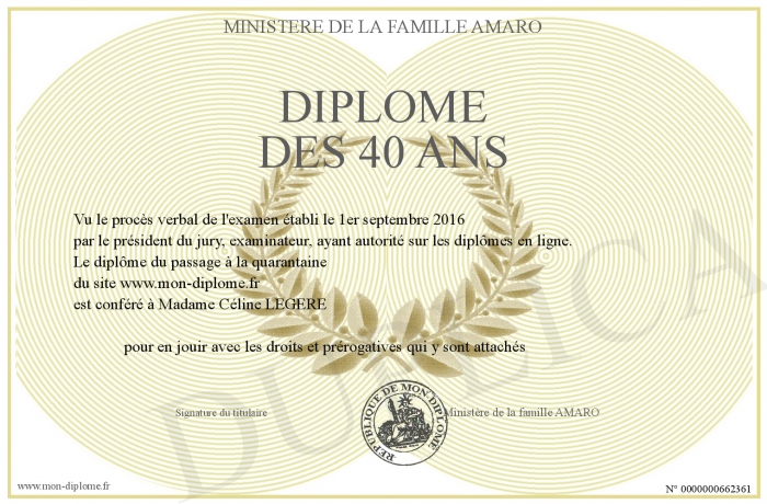 Envoyez par email votre Diplôme des 40 ans personalisé