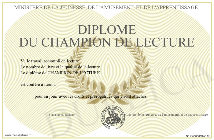 Envoyez par email votre Diplôme du champion de lecture personalisé