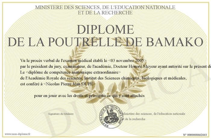 Envoyez par email votre Diplôme de la Poutrelle de Bamako personalisé