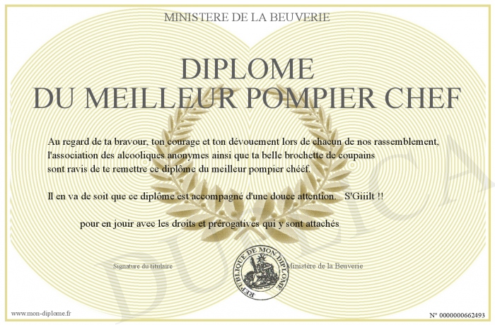 Envoyez par email votre Diplôme du meilleur pompier chéf personalisé