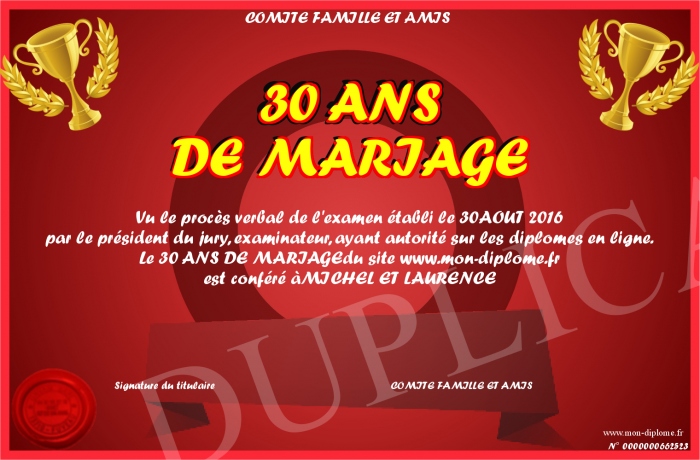 Envoyez par email votre 30 ANS DE MARIAGE personalisé