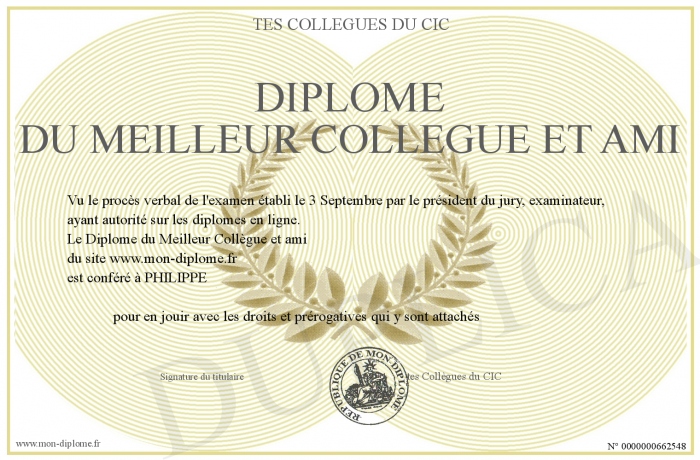Envoyez par email votre Diplôme du Meilleur Collègue et ami personalisé