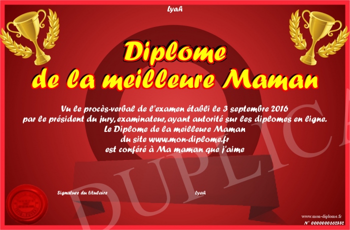 Envoyez par email votre Diplome de la meilleure Maman personalisé