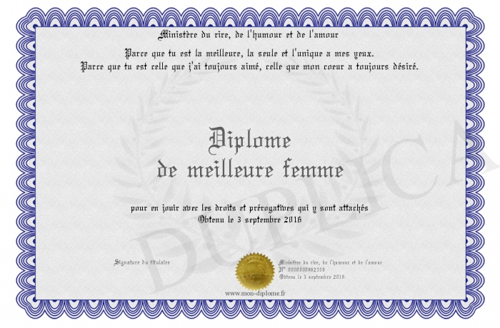 Envoyez par email votre Diplome de meilleure femme personalisé
