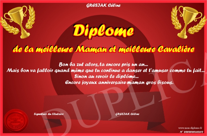 Envoyez par email votre Diplome de la meilleure Maman et meilleure Cavalière personalisé