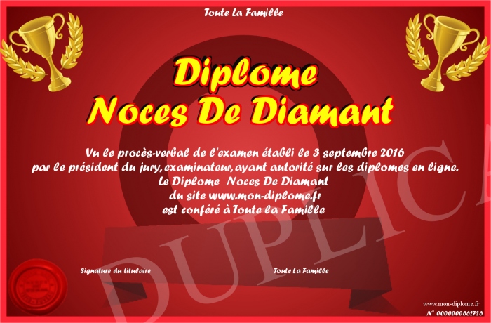 Envoyez par email votre Diplôme Noces De Diamant personalisé