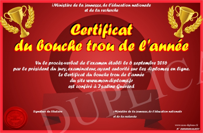 Envoyez par email votre Certificat du bouche trou de l'année personalisé