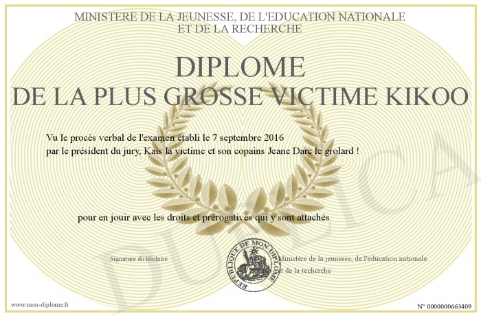 Envoyez par email votre Diplôme de la plus grosse victime kikoo personalisé