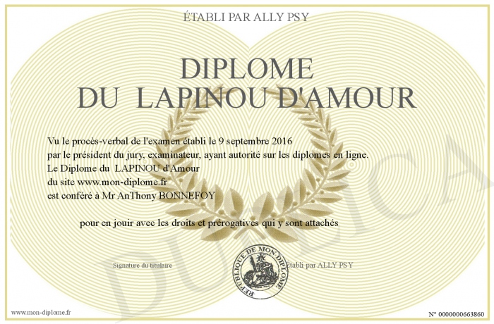 Envoyez par email votre Diplôme du LAPINOU d'Amour personalisé