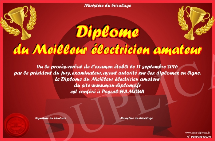 Envoyez par email votre Diplôme du Meilleur électricien amateur personalisé