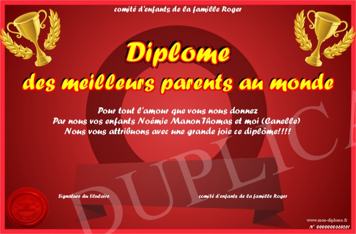 Envoyez par email votre Diplôme des meilleurs parents au monde personalisé