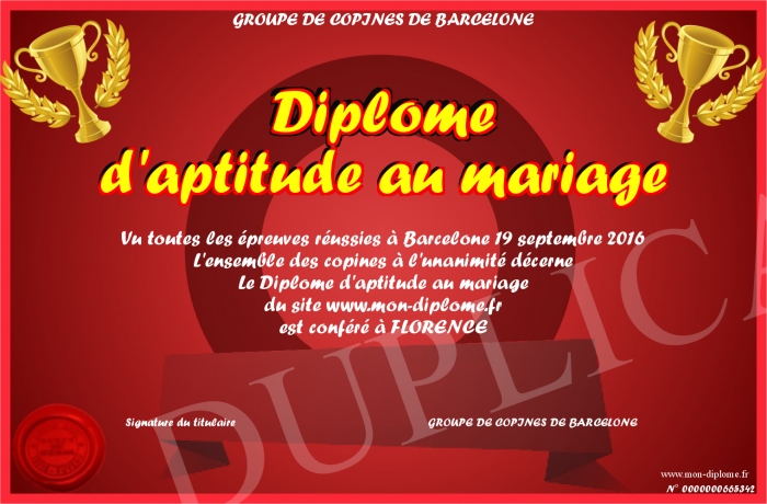 Envoyez par email votre Diplome d'aptitude au mariage personalisé