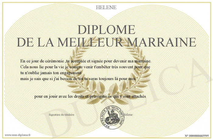 Envoyez par email votre Diplôme de la meilleur marraine personalisé