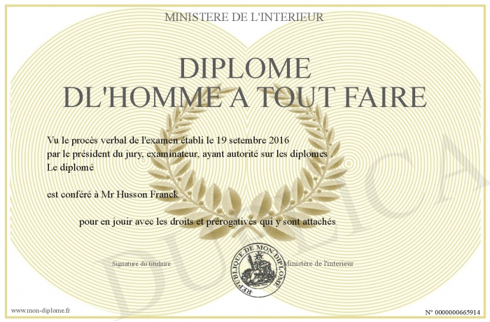 Envoyez par email votre Diplôme dl'homme a tout faire personalisé