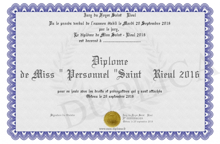 Envoyez par email votre Diplôme de Miss - Personnel -Saint Rieul 2016 personalisé
