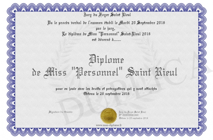 Envoyez par email votre Diplôme de Miss -Personnel- Saint Rieul personalisé