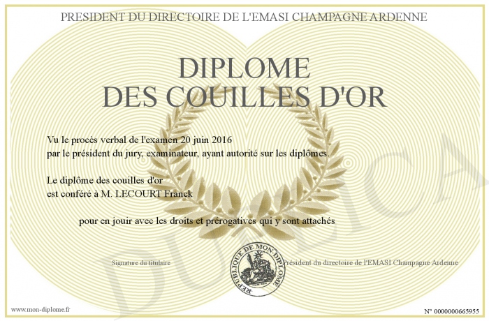 Envoyez par email votre Diplôme des couilles d'or personalisé