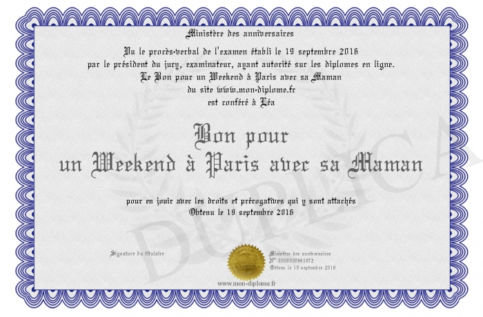 Envoyez par email votre Bon pour un Weekend à Paris avec sa Maman personalisé