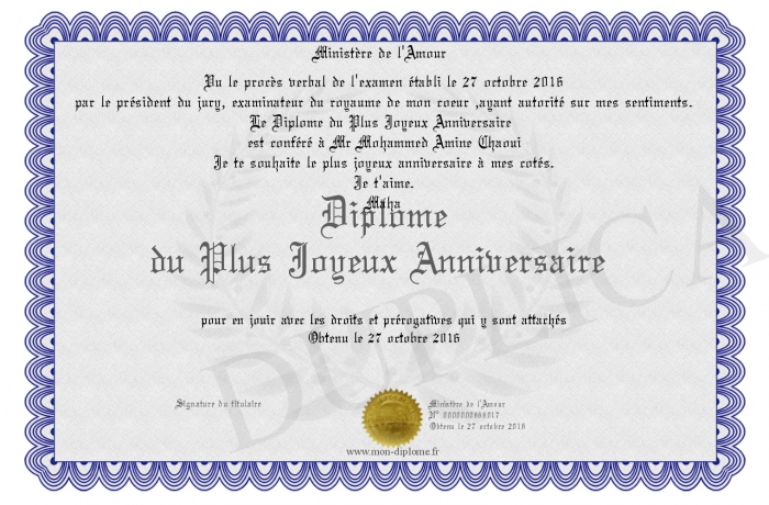 Envoyez par email votre Diplôme du Plus Joyeux Anniversaire personalisé