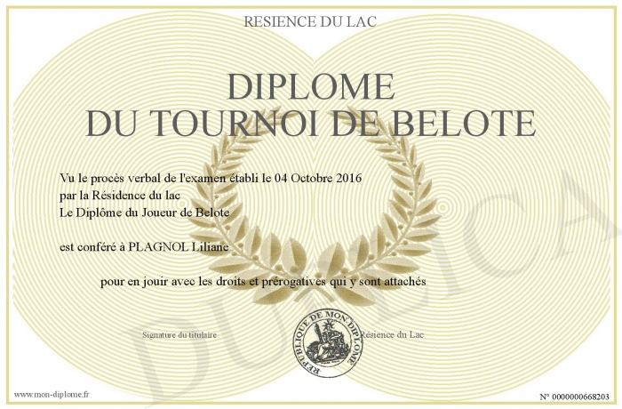 Envoyez par email votre diplome du Tournoi de belote personalisé