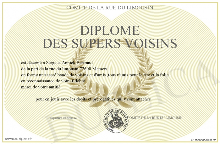 Envoyez par email votre Diplôme des supers voisins personalisé
