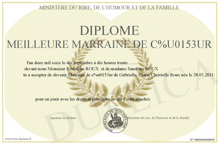 Envoyez par email votre Diplome meilleure marraine de coeur personalisé