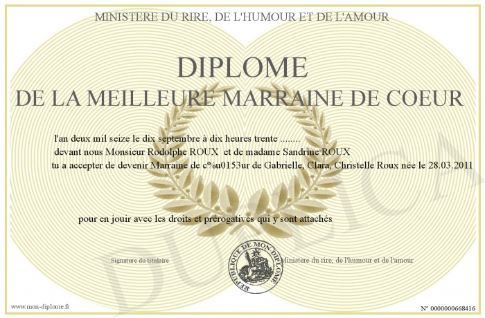 Envoyez par email votre Diplôme de la meilleure Marraine de coeur personalisé
