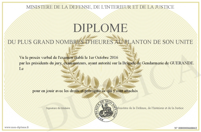 • Diplôme du plus grand nombres d'heures au planton de son unité
