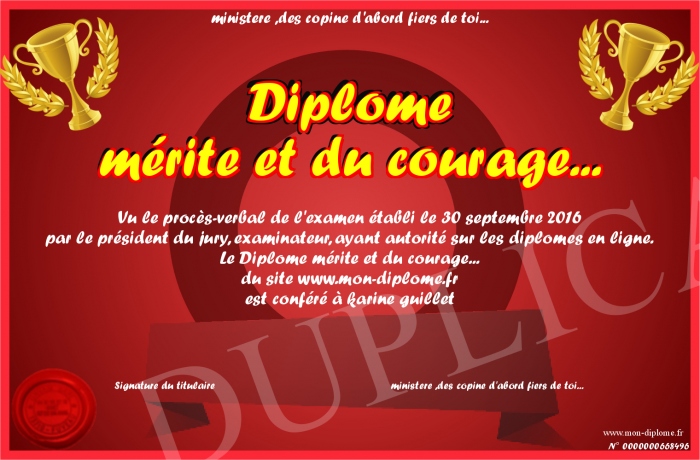 Envoyez par email votre Diplôme mérite et du courage... personalisé