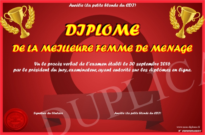 Envoyez par email votre DIPLOME DE LA MEILLEURE FEMME DE MENAGE personalisé