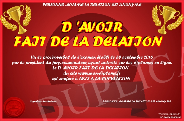 Envoyez par email votre D 'AVOIR FAIT DE LA DELATION personalisé