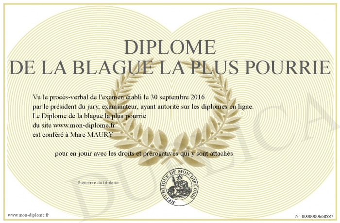 Envoyez par email votre Diplôme de la blague la plus pourrie personalisé