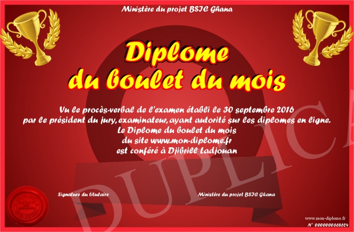 Envoyez par email votre Diplôme du boulet du mois personalisé