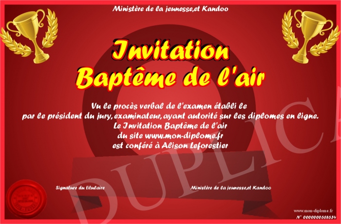 Envoyez par email votre Invitation Baptême de l'air personalisé