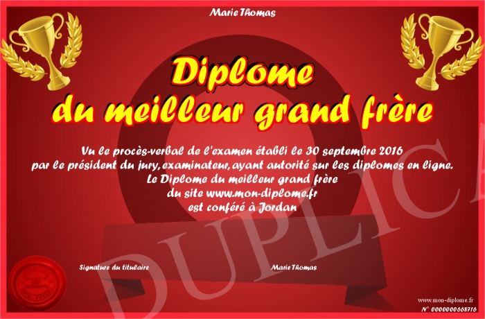 Envoyez par email votre Diplôme du meilleur grand frère personalisé