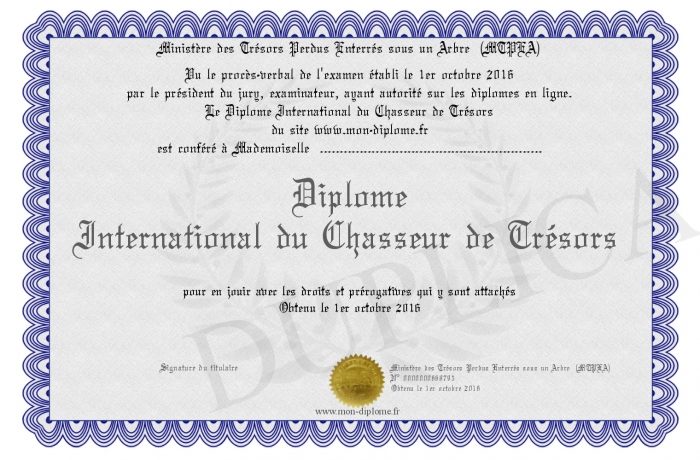 Envoyez par email votre Diplôme International du Chasseur de Trésors personalisé