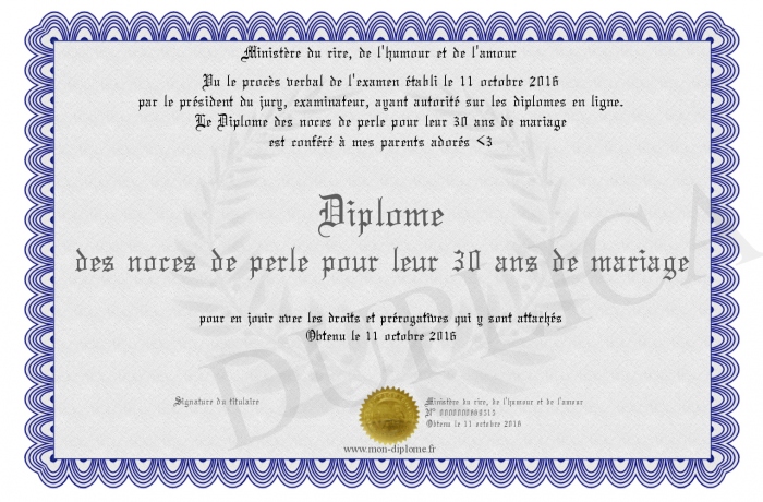 Envoyez par email votre Diplôme des noces de perle pour leur 30 ans de mariage personalisé