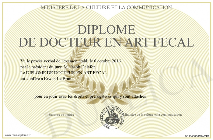 Envoyez par email votre DIPLOME DE DOCTEUR EN ART FECAL personalisé