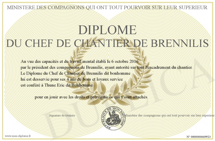 Envoyez par email votre Diplôme du Chef de Chantier de Brennilis personalisé