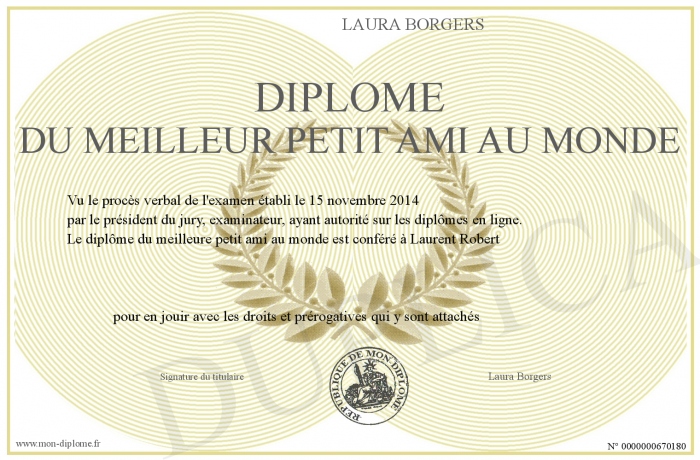 Envoyez par email votre Diplôme du meilleur petit ami au monde personalisé