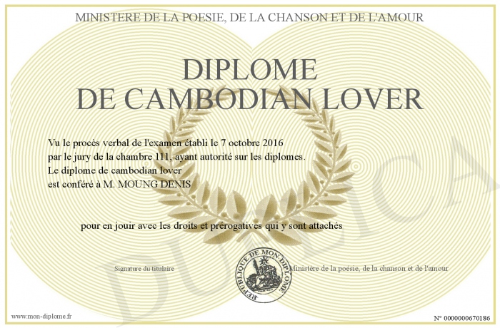 Envoyez par email votre Diplôme de cambodian lover personalisé